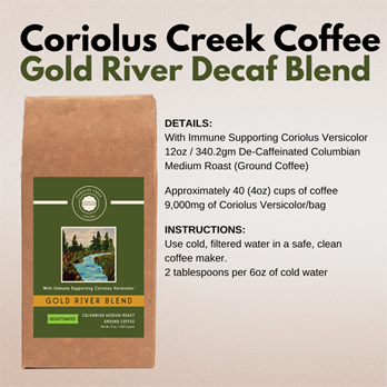 Gold River Blend is a rich, medium roast de-caffeinated, Columbian coffee that is ground to perfection and includes the powerful immune-supporting supplement known as Coriolus Versicolor. This coffee is roasted, ground, and shipped much faster than most coffees found in stores and at your local coffee house, ensuring what we believe to be the freshest coffee flavored experience you can have. Every hand-packed bag is filled with the exceptional coffee you deserve. These large beans feature undertones of juicy lemons, brown sugar, and milk chocolate that create a medium bodied, sweet tasting decaffeinated coffee with a rich flavor and aroma. If you are new to buying freshly roasted coffee and don’t know where to begin, or it you’re a veteran, this selection will satisfy your coffee craving!